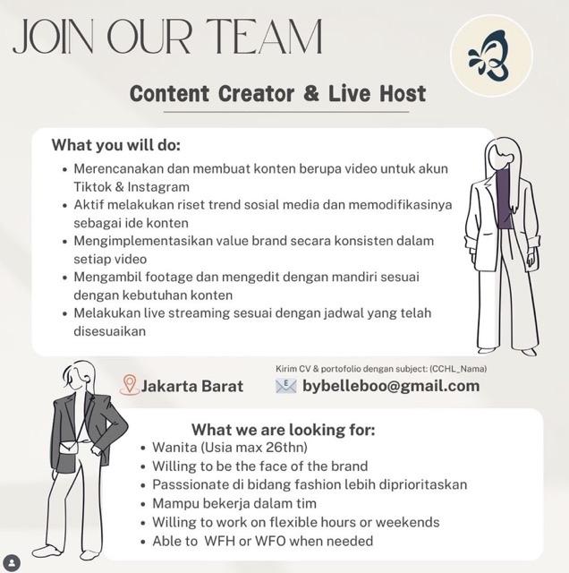 Y2F.Media — Belle & Boo, brand fashion terbaru yang fokus pada busana Korean look dan tas, sedang mencari individu bertalenta untuk bergabung sebagai Live Host! Jika Anda seorang wanita berusia 17-35 tahun dan memiliki minat besar pada dunia fashion Korea, ini kesempatan emas untuk jadi bagian dari tim kami. Posisi ini berlokasi di Jakarta Barat dengan sistem kerja WFO yang fleksibel, jadwalnya bisa didiskusikan nanti agar sesuai untuk Anda.