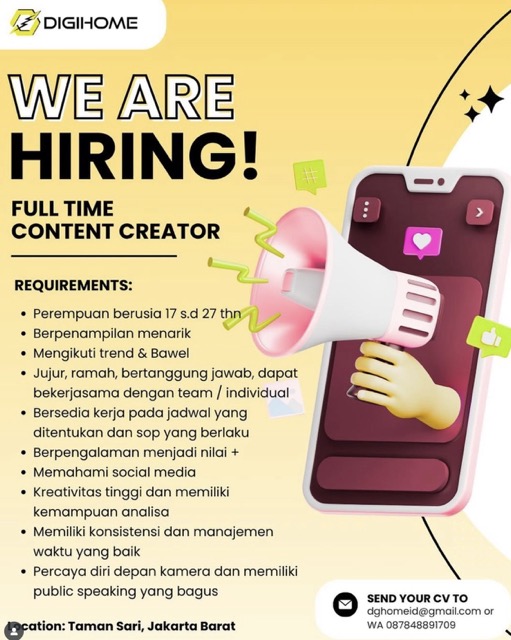 Y2F.Media — Punya ide-ide segar dan jago banget bikin konten? DGHOMEE lagi mencari Content Creator nih untuk bergabung dengan tim kami! Kami ingin kamu jadi bagian dari tim yang dinamis dan ikut berpartisipasi dalam setiap ide kreatif untuk brand kami. Yuk, tunjukkan kemampuan terbaikmu dalam membuat konten yang menarik dan berbeda dari yang lain.