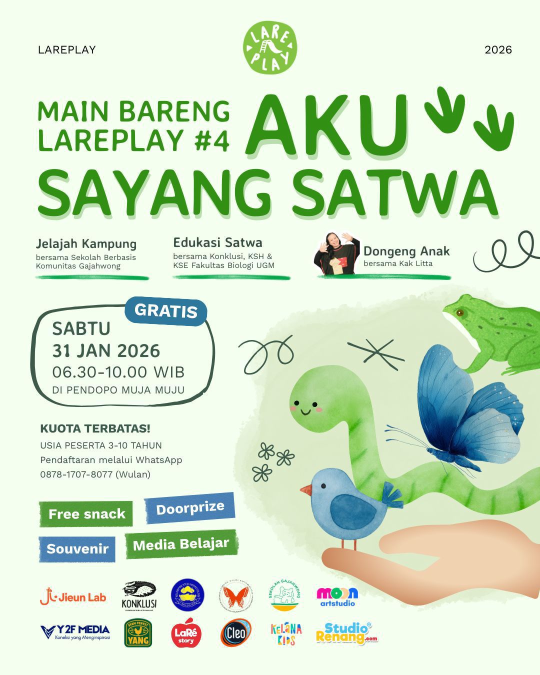 Y2F. Media — Lareplay kembali menghadirkan ruang bermain dan belajar yang bermakna bagi anak-anak melalui kegiatan Main Bareng Lareplay #4: Aku Sayang Satwa, yang akan diselenggarakan pada Sabtu, 31 Januari 2026, bertempat di Pendopo Muja Muju, Yogyakarta. Kegiatan ini dirancang sebagai pengalaman bermain-edukatif yang mengajak anak untuk mengenal satwa dan lingkungan sekitar secara menyenangkan, aman, dan sesuai dengan dunia anak.