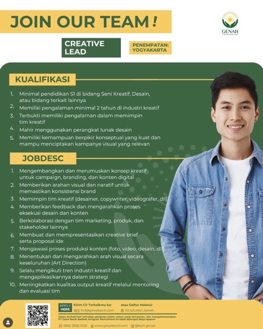 Y2F.Media — PT. Gawe Becik Nadhah Anugrah (GENAH), perusahaan digital marketing yang sedang berkembang pesat di Yogyakarta, sedang mencari Creative Lead berbakat untuk bergabung dengan tim kami. Jika Anda punya visi kreatif yang kuat dan siap memimpin tim dalam menciptakan campaign melalui Facebook Ads, TikTok Ads, dan Google Ads, ini kesempatan emas untuk Anda. Bergabunglah bersama kami dan bantu brand kami untuk tumbuh lebih cepat lagi!