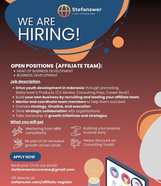 Lebih dari itu, Anda juga akan mendapatkan mentoring langsung dari konsultan MBB (McKinsey/Bain/BCG) untuk membangun keterampilan bisnis dan pemasaran yang sesungguhnya. Ada juga kesempatan untuk memimpin tim Anda sendiri dan mengelola inisiatif pertumbuhan melalui jalur Head of Affiliate (opsional). Dengan komitmen waktu yang minimal, Anda bisa meraih pertumbuhan jangka panjang untuk personal branding dan pendapatan pasif. Tertarik? Kirim CV Anda ke [email protected] atau daftar langsung di stefanswer.com/affiliate-register. Untuk info lebih lanjut, hubungi Vito via WhatsApp di 0813 8662 7863.