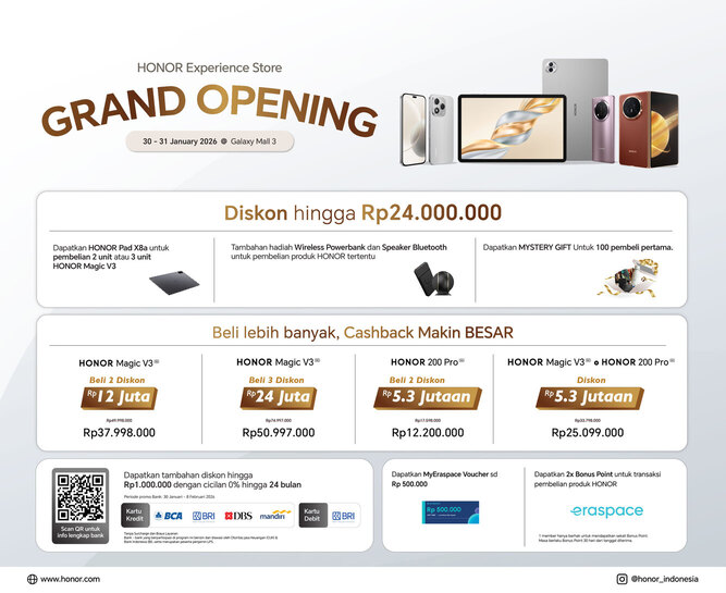 Tak hanya itu, HONOR juga memberikan hadiah langsung bagi pelanggan selama periode promo 30 Januari hingga 28 Februari 2026. 30 pelanggan pertama berkesempatan mendapatkan free wireless charger untuk setiap pembelian HONOR Magic V3 dan HONOR 200 Pro, serta free portable speaker untuk setiap pembelian HONOR 400, HONOR 400 Lite, dan HONOR X9c. Selain itu, 100 pelanggan pertama yang melakukan pembelian saat acara Grand Opening juga berkesempatan mendapatkan mystery gift berisi berbagai hadiah menarik, mulai dari tote bag, payung, tumbler, selfie stick, hingga speaker, dengan syarat dan ketentuan berlaku.