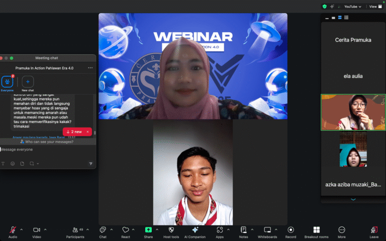 Y2F. Media — Webinar bertajuk “Pramuka In Action: Pahlawan Era 4.0” sukses diselenggarakan secara daring pada 9 November 2025. Kegiatan ini mengangkat tema “Pramuka yang Cerdas, Anti Hoaks, dan Anti Intoleran”, diselenggarakan oleh kanal Cerita Pramuka, dan diikuti oleh peserta dari berbagai daerah di Indonesia mulai dari Jawa Timur, Sulawesi Utara, Kalimantan Timur, Jambi, hingga Jawa Tengah.