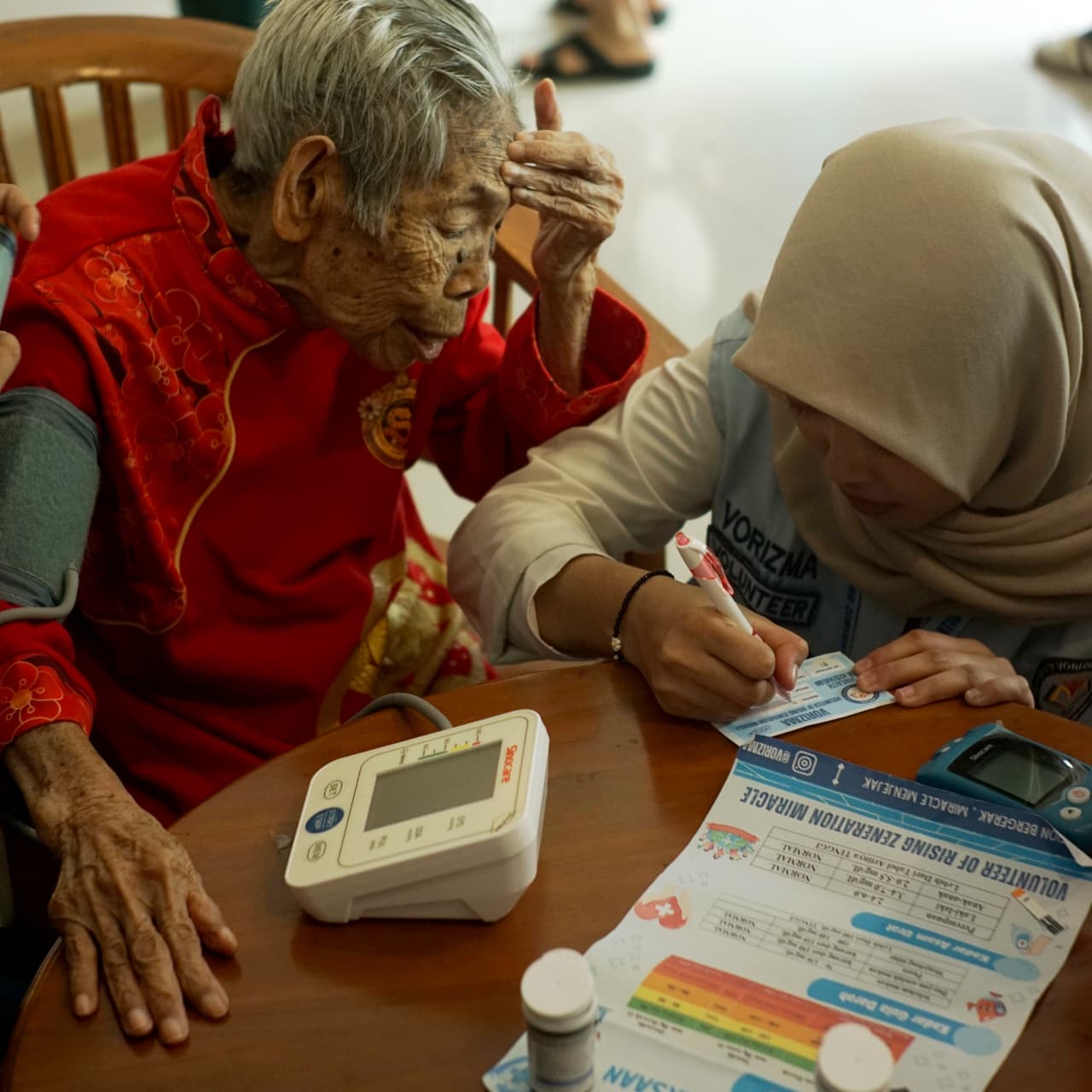 Para relawan terlihat antusias dan bersemangat selama kegiatan berlangsung. Mereka tidak hanya membantu proses pemeriksaan kesehatan, tetapi juga mendampingi oma-opa dalam membuat gelang, mendengarkan cerita, serta membangun komunikasi yang hangat dan penuh empati.